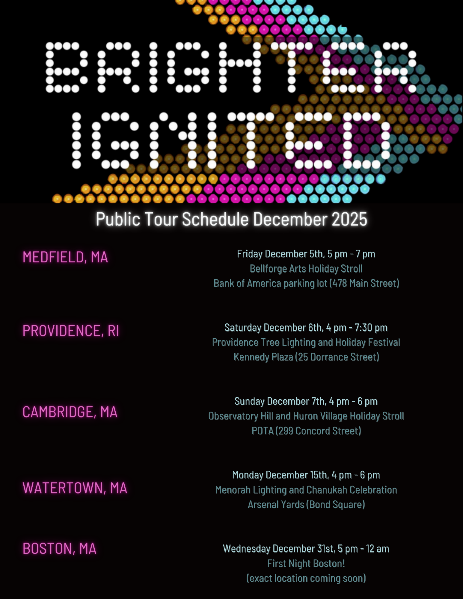 2. Brighter Ignited, my giant, illuminated, interactive, traveling light display had a lot of fun last winter at the Seaport in Boston, Arsenal Yards in Watertown, the LexLux Festival in Lexington and at WinterFest in Newton. Now booking for this winter! Contact me if you are interested in bringing the installation to your event.