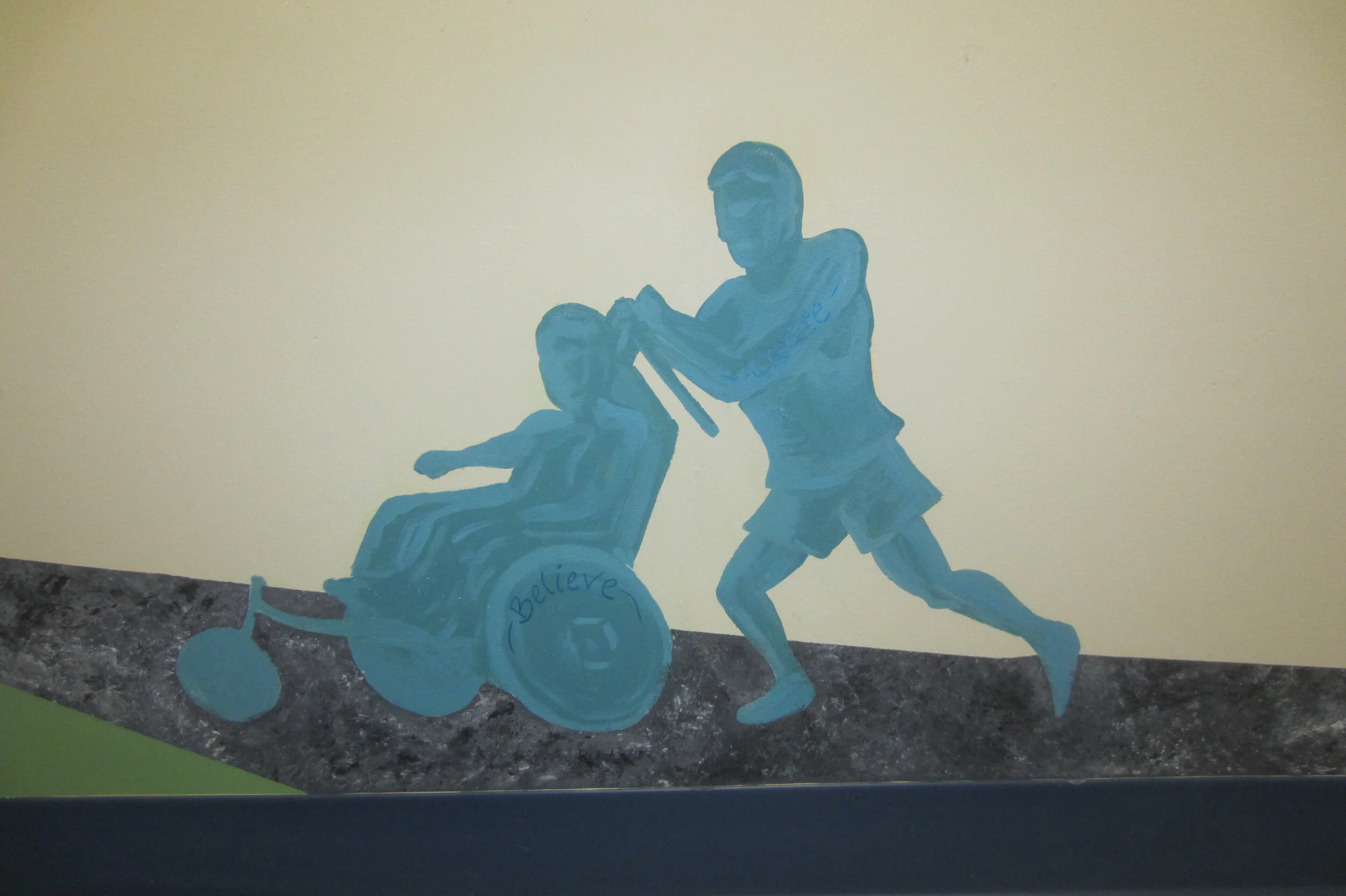 This community mural was a collaboration of the Healthy Balance Committee at Milford Regional Medical Center (MRMC), Painting and Design students at Blackstone Valley Technical High School (BVT), and mural artist Tova Speter. It was conceived of as a way to encourage people to take the stairs more often and hopes to inspire users on their journey to better health and wellness.